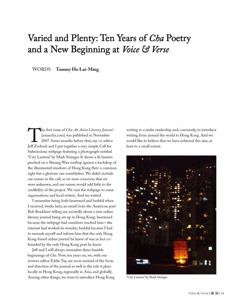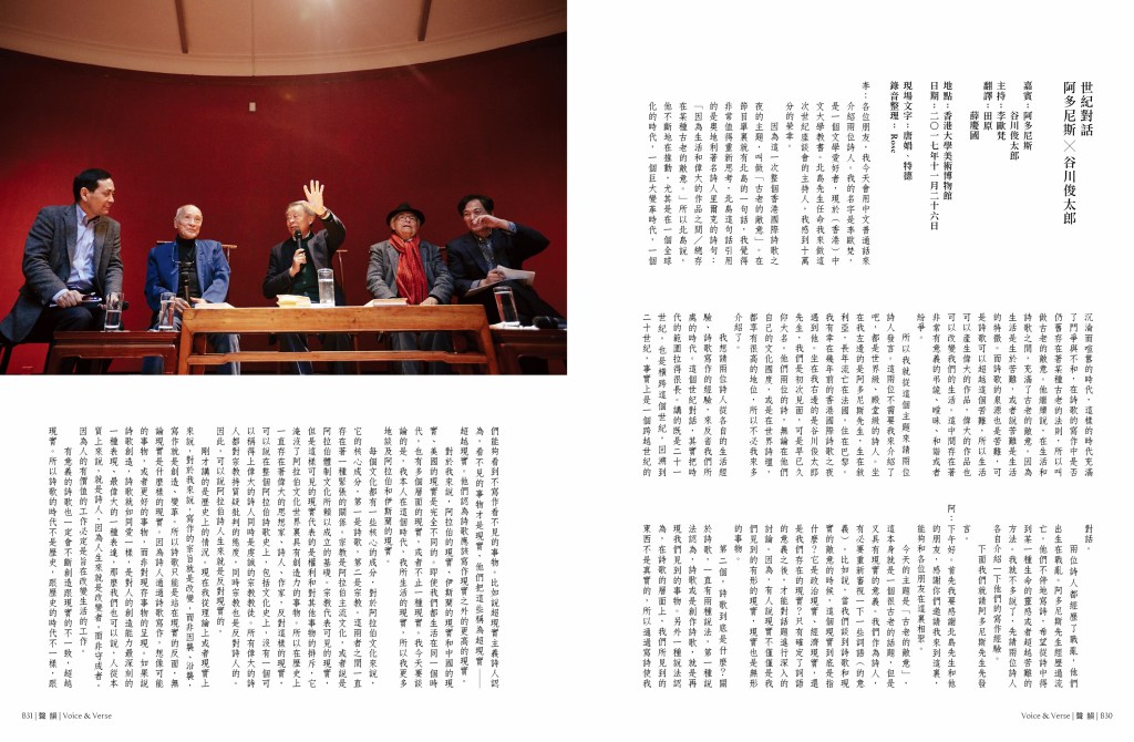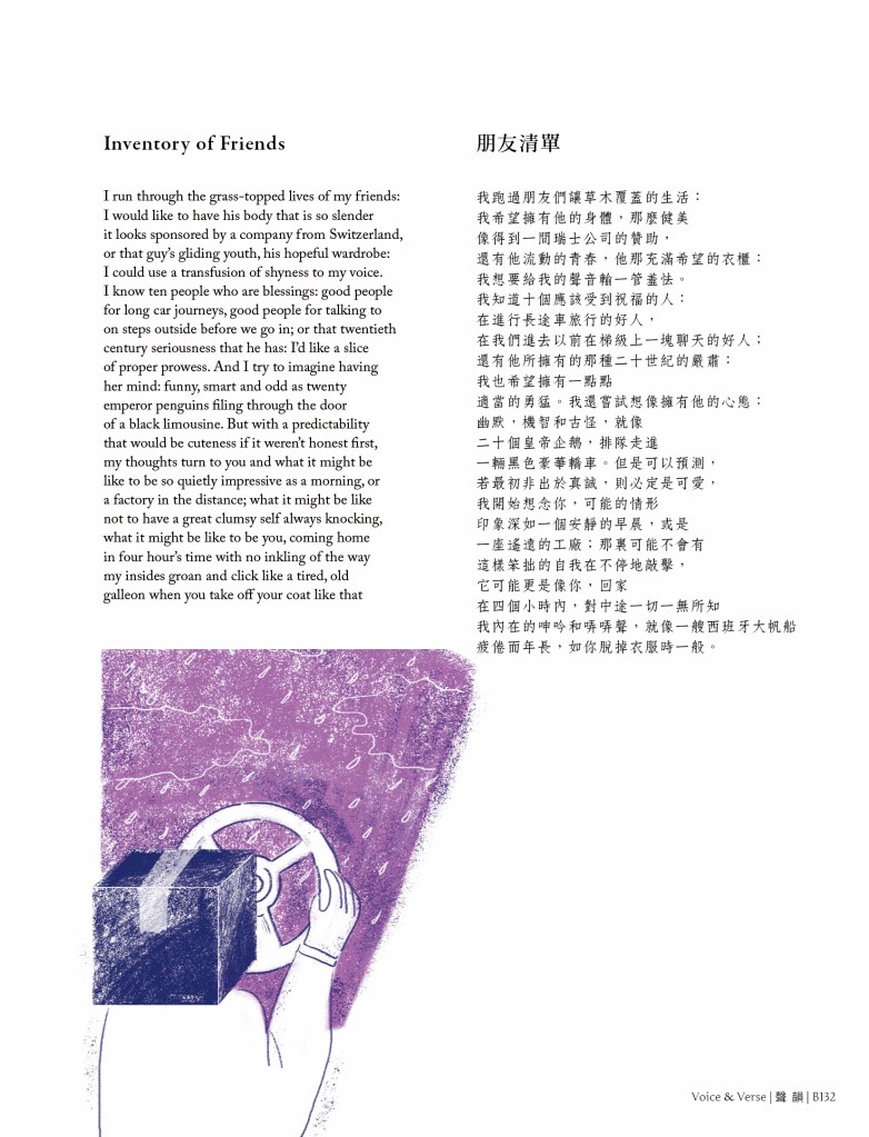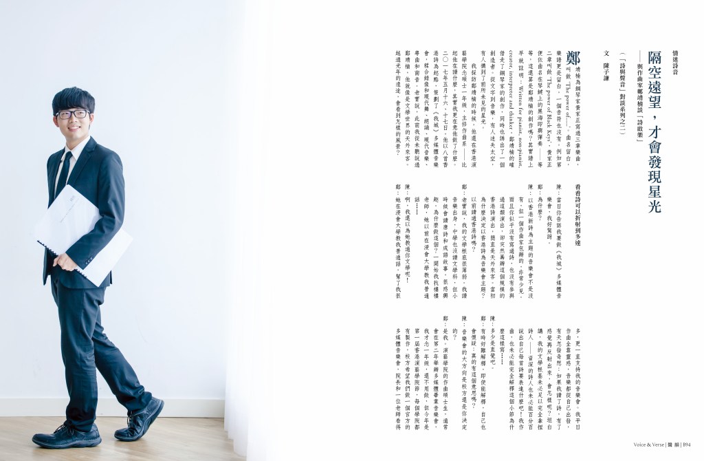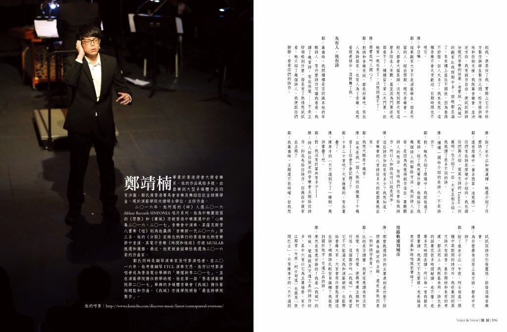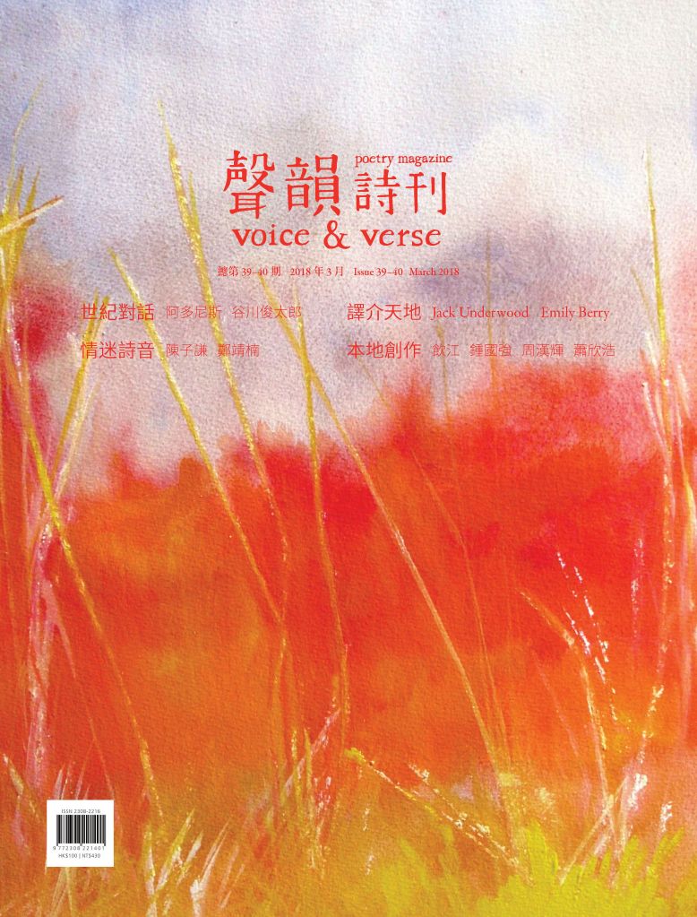 雜誌 MAGAZINE第39-40期 Issues 39-40 by 聲韻詩刊 Voice & Verse Poetry MagazineMarch 24, 2020April 6, 2020 「香港國際詩歌之夜:古老的敵意」專輯|CHA Tenth Anniversary Special Feature 封面 A 攝影:左藍.波博斯基Cover A Image: Zoran Poposki 目錄 TOC A下載 Download CHA Tenth Anniversary Special FeaturePhotographs by Aaron Anfinson 封面 B 畫作:斯蒂文.施羅德Cover B Image: Steven Schroeder 目錄 TOC B下載 Download 「香港國際詩歌之夜:古老的敵意」專輯陳子謙〈隔空遠望,才會發現星光:與作曲家鄭靖楠談「詩啟樂」〉馬喬、宋子江譯:Jack Underwood與Emily Berry 預覽 Preview Share this: Click to share on Facebook (Opens in new window) Facebook Click to share on X (Opens in new window) X Click to share on WhatsApp (Opens in new window) WhatsApp Click to email a link to a friend (Opens in new window) Email Like Loading... Related