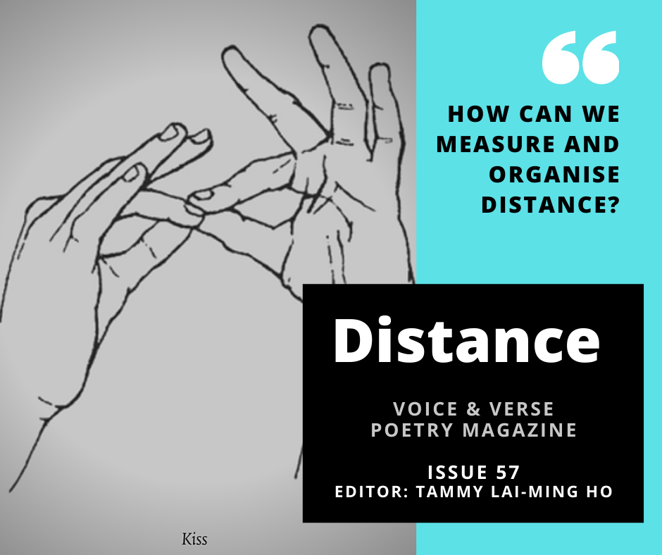 In Issue 57 of 聲韻詩刊 Voice & Verse Poetry Magazine, we will publish an English-language section on “Distance”. Previously unpublished poems on this topic can be sent to swpoetry@gmail.com before 15 November 2020 with the subject line “VV: Distance: [your initials]” for consideration. Each poet can submit up to two poems (please do not send us PDFs). NOTE: Only poets whose work is accepted will be notified. If you do not hear a response within two weeks, please assume that your work has not been selected for publication. Editor of the section: Tammy Lai-Ming Ho.