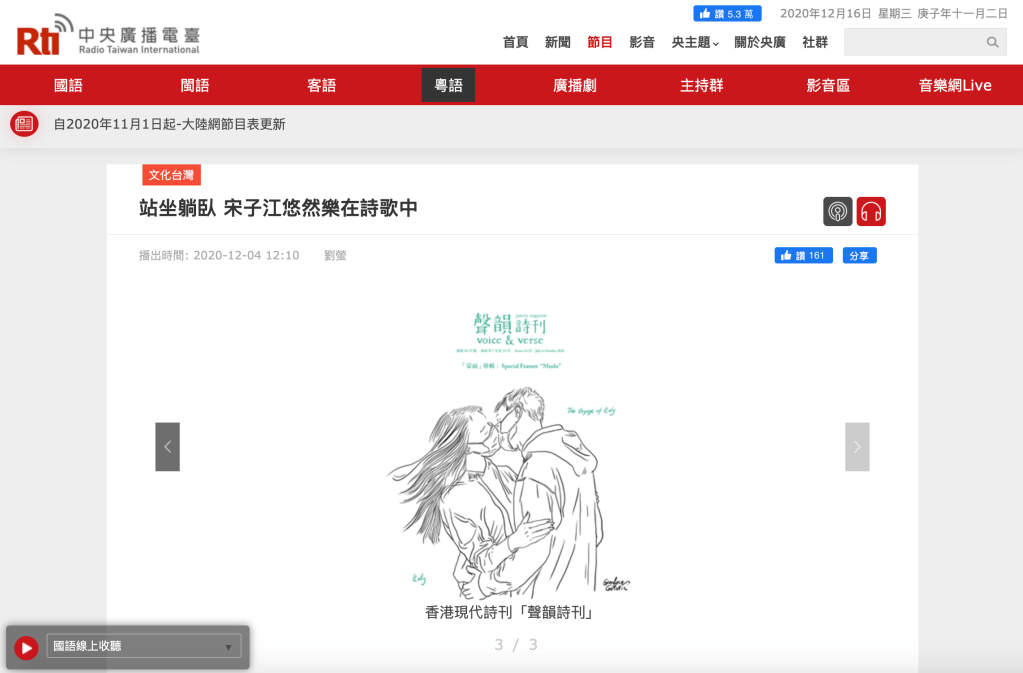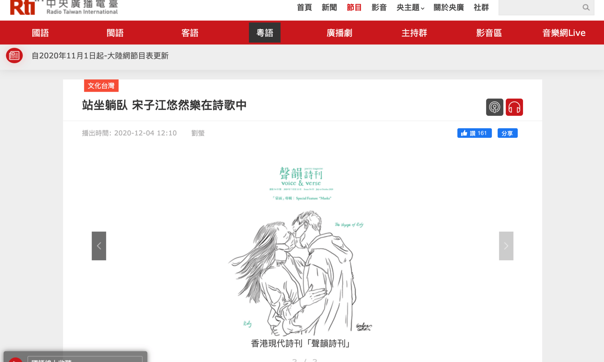 Uncategorized主編接受中央廣播電臺粵語頻道「文化台灣」節目訪問談《聲韻詩刊》 by 聲韻詩刊 Voice & Verse Poetry MagazineDecember 16, 2020 點擊以下圖片重溫節目錄音! 「身邊有很多志同道合的朋友,大家一起研究、交流、切磋,做自己力所能及的事,就像聲韻詩刊,聲韻詩刊的持續出版,就是團隊努力的成果。」 Share this: Click to share on Facebook (Opens in new window) Facebook Click to share on X (Opens in new window) X Click to share on WhatsApp (Opens in new window) WhatsApp Click to email a link to a friend (Opens in new window) Email Like Loading... Related