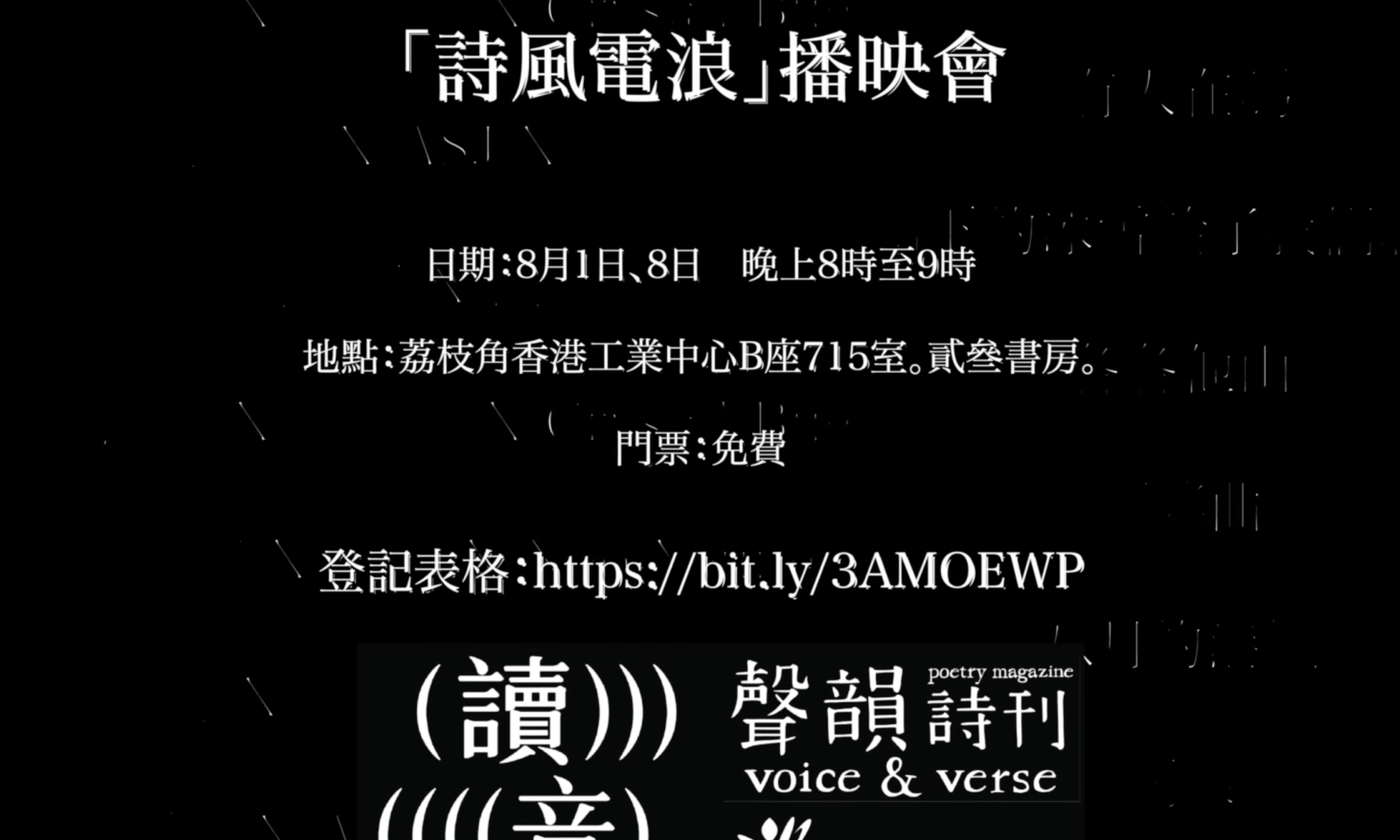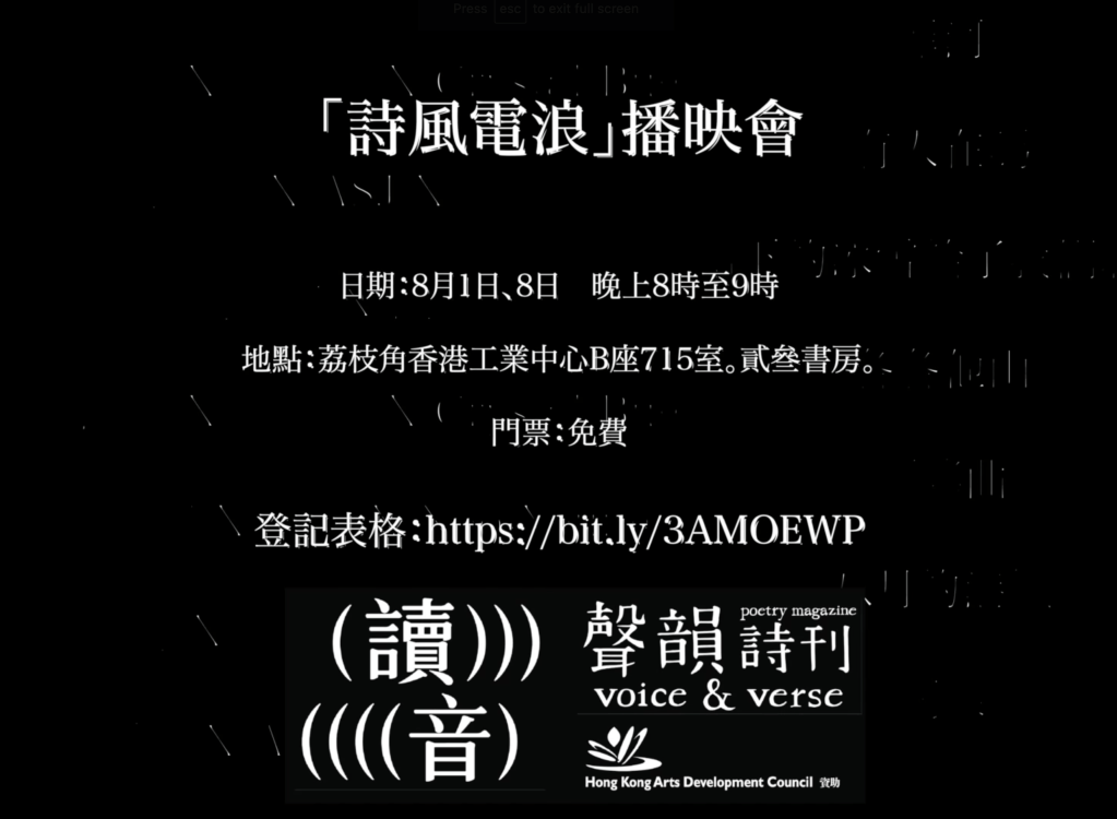 「詩風電浪」由《讀音》X《聲韻詩刊》策劃,香港藝術發展局資助。播映會場地由貳叄書房提供。