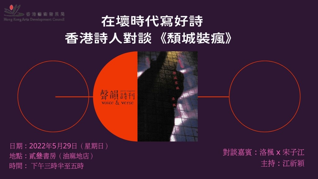 如何在壞時代寫好自己的詩?話說倩女為了逃避宰相的權力魔爪,扮作瘋癲避禍,書生以陽傘護送陰魂千里逃亡,這是唐滌生粵劇《再世紅梅記》的故事,也是〈頹城裝瘋〉的隱喻。在佈滿玻璃碎片的時代,寫詩可以照見自己破碎的容顏,讀詩可以重組碎裂的生活和意志,祗要識字,無須認證!在風雨的季候談文字鎮痛和療癒的力量,我們如何借詩還魂!