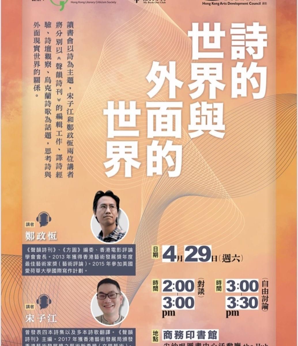 講座以詩為主題,宋子江和鄭政恆兩位講者將分別以《聲韻詩刊》的編輯工作、譯詩經驗、詩壇觀察、烏克蘭詩歌為話題,思考詩與外面現實世界的關係。