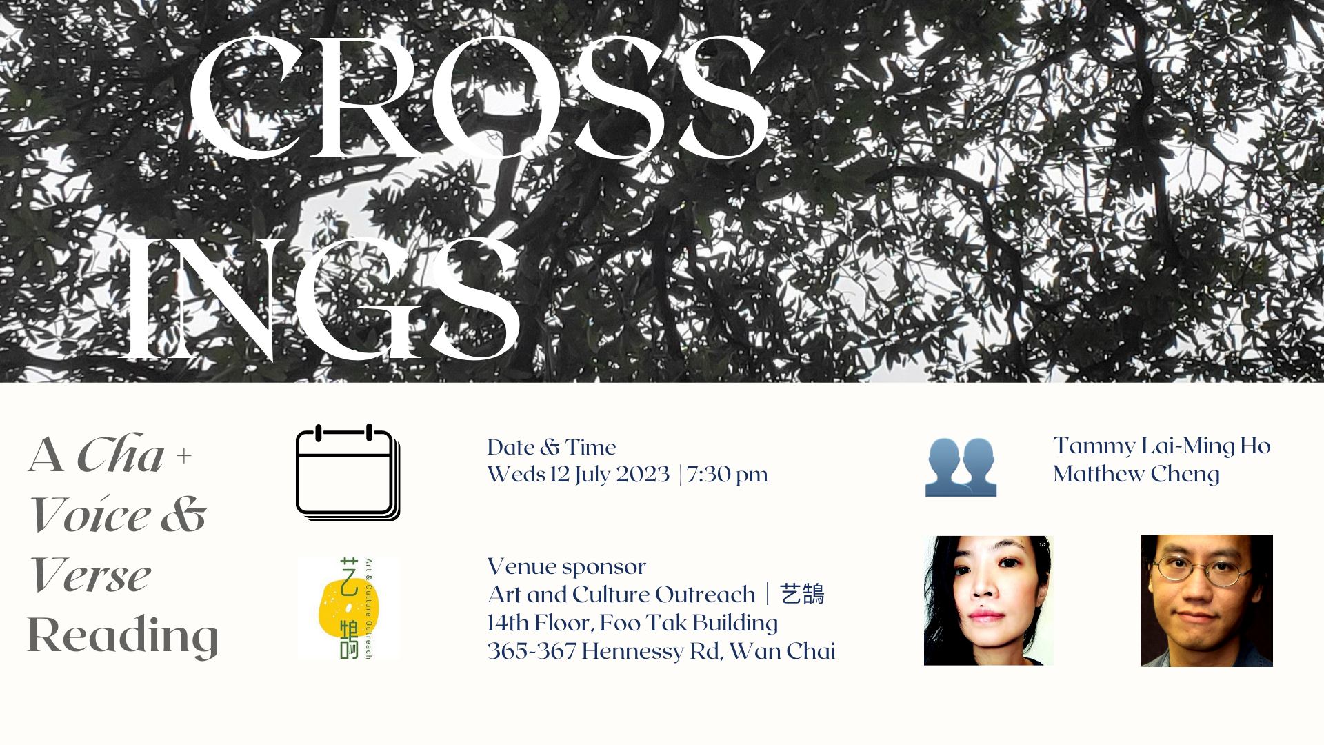 We are very pleased to introduce the readers at 𝐂𝐑𝐎𝐒𝐒𝐈𝐍𝐆𝐒—𝐀 𝐉𝐨𝐢𝐧𝐭 𝐂𝐡𝐚 + 𝐕𝐕 𝐏𝐨𝐞𝐭𝐫𝐲 𝐑𝐞𝐚𝐝𝐢𝐧𝐠, jointly organised by Cha: An Asian Literary Journal and 聲韻詩刊 Voice & Verse Poetry Magazine, hosted by Tammy Lai-Ming Ho (𝑪𝒉𝒂 and 𝑽𝒐𝒊𝒄𝒆 & 𝑽𝒆𝒓𝒔𝒆) and Matthew Cheng (𝑽𝒐𝒊𝒄𝒆 & 𝑽𝒆𝒓𝒔𝒆). Please come to say Hello on Wednesday 12 July 2023. It will be a lovely evening, a poerty party.