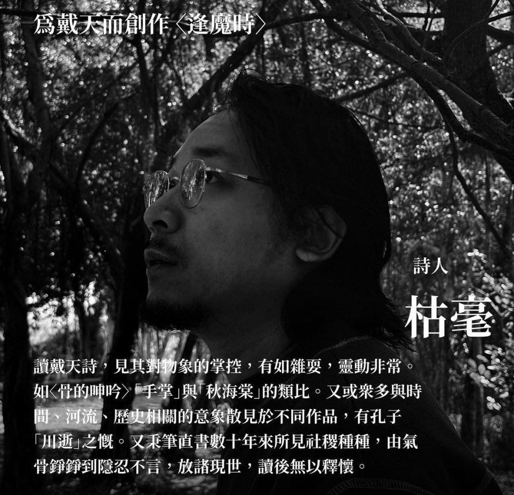 枯毫:時間是 2024 年。地點是城西,人物是陳嘉。事件是,突然,她的音樂,冒出黑光。問十個人,也不會有一個認為戴天詩與陳嘉音樂能連繫上。但戴天不拘泥舊意象,善造新句,喜於開拓,這點與陳嘉創作的意念相合。我只是其中的細線,沾了粉末。期待日後有更多合作。(段首化用自戴天〈石頭記〉。)