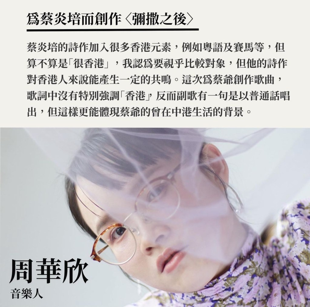 另一組是香港詩人李文靜與獨立歌手周華欣合作,為蔡炎培而創作〈彌撒之後〉。