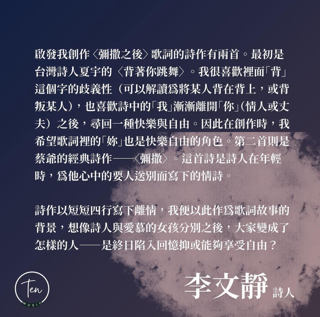 啟發李文靜創作〈彌撒之後〉歌詞的詩作有兩首。第一首是台灣詩人夏宇的〈背著你跳舞〉,第二首是蔡爺的經典詩作〈彌撒〉,「這首詩是詩人在年輕時,為他心中的要人送別而寫下的情詩。詩作以短短四行寫下離情,我便以此作為歌詞故事的背景,想像詩人與愛慕的女孩分別之後,大家變成了怎樣的人——是終日陷入回憶抑或能夠享受自由?」